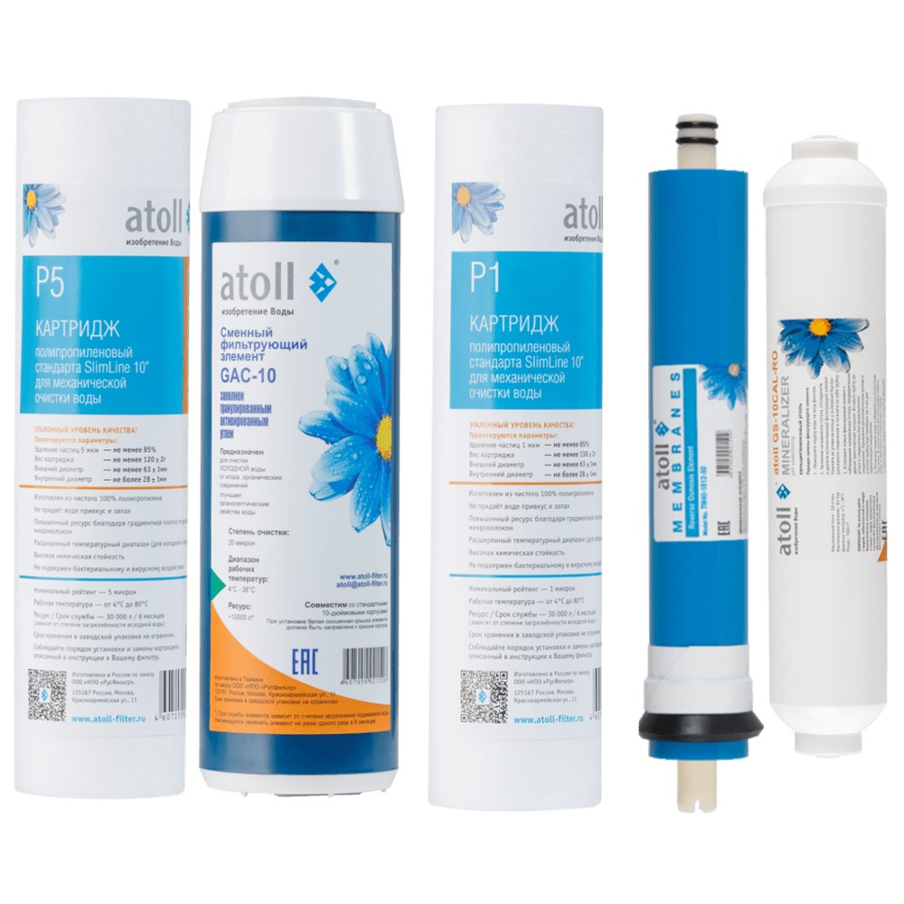 Полный набор картриджей Atoll №102m STDA  предназначен для замены использованных элементов в системах обратного осмоса.  Содержит 3 картриджа для блока префильтрации, мембрану и минерализатор.  Подходит для моделей A-550m , A-560Em. Рекомендуемый срок замены: 24 месяца. Набор картриджей Atoll с индексом «m» — с минерализатором вместо постфильтра. Комплектация набора Atoll №102m STDA Модуль atoll P5 (полипропилен) для очистки воды от механических примесей. Обладает высокой устойчивостью к воздействию бактерий и химикатов. Задерживает частицы размером более 5 мкм Модуль atoll GAC-10 (гранулированный активированный уголь) предназначен для устранения механических, органических и хлорорганических примесей. Модуль atoll P1 (полипропилен) для очистки воды от механических примесей. Обладает высокой устойчивостью к воздействию бактерий и химикатов. Задерживает частицы размером более 1 мкм Мембрана atoll TW40-1812-50. Селективность 99%; Минерализатор — atoll GS 10CAL/RO (порошковый активированный уголь c кальцитом). Поглощает остаточные запахи и загрязнения и повышает уровень pH.