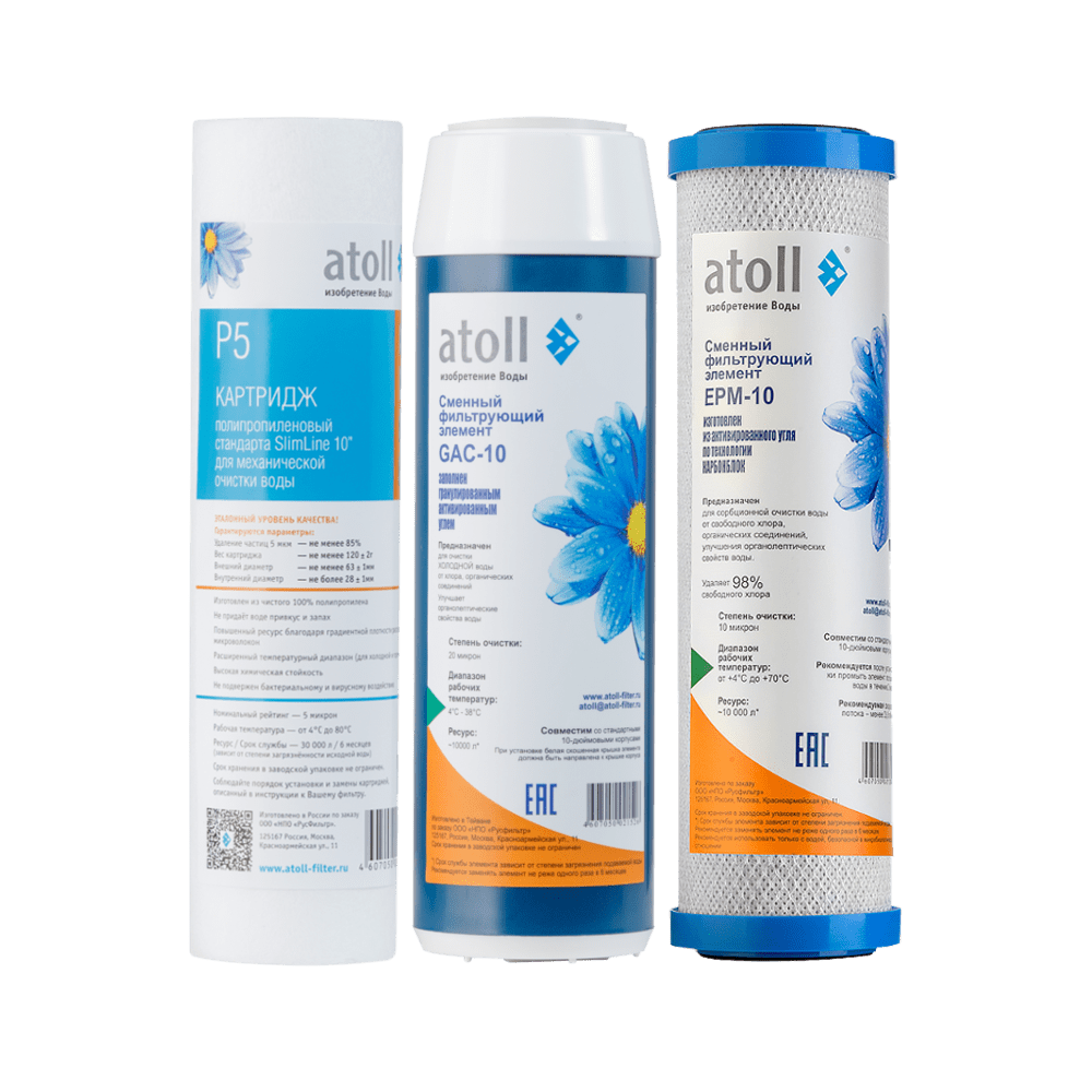 Набор картриджей Atoll №203 STDA предназначен для замены использованных элементов в системах обратного осмоса  —  A-550E, A-560, A-560Е, A560Em, A-560Ecp, A-575, A-575E, A-575Em, A-575Ecp  (для сильно хлорированной воды, удаление запаха хлора) Содержит три предфильтра. Рекомендуемый срок замены: 6 месяцев. Набор картриджей Atoll №203 STDA содержит: Картридж atoll P5 (полипропилен) для очистки воды от механических примесей. Обладает высокой устойчивостью к воздействию бактерий и химикатов. Задерживает частицы размером более 5 мкм Картридж atoll GAC-10 (гранулированный активированный уголь) предназначен для устранения механических, органических и хлорорганических примесей. Задерживает частицы размером более 20 мкм Картридж atoll EPM-10 (прессованный активированный уголь) предназначен для устранения механических примесей. Задерживает частицы размером крупнее 10 мкм. Улучшенные показатели очистки от хлора.