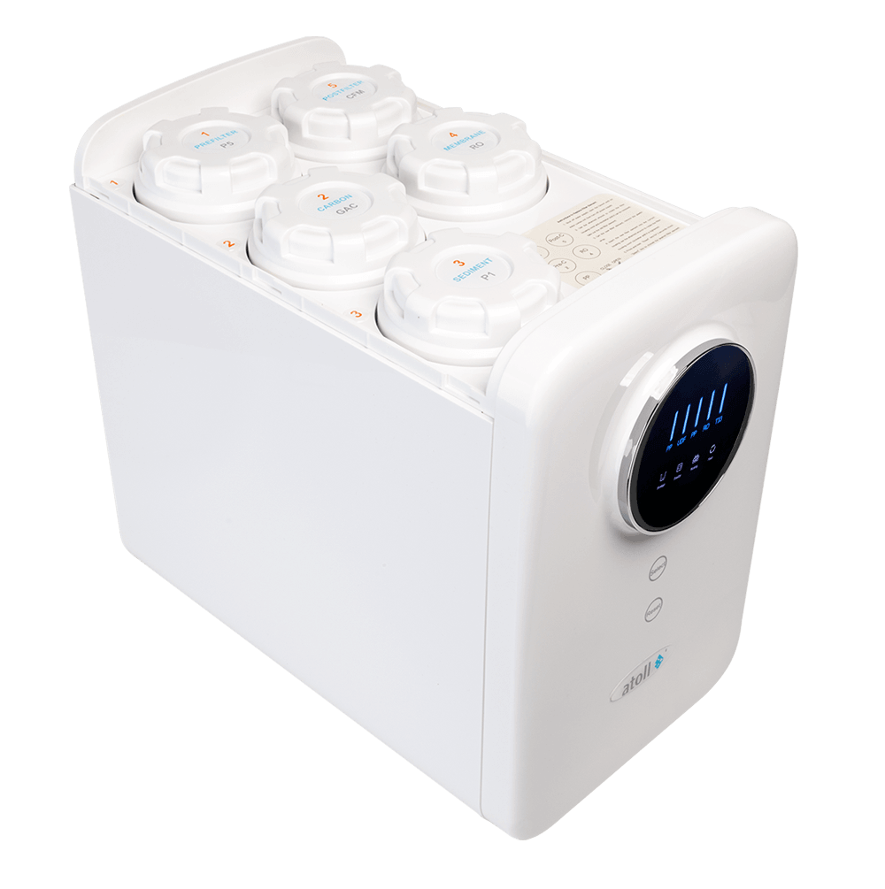Модель atoll A-5500mp STD (Cruise) относится к категории бытовых фильтров обратного осмоса прямоточного типа (без накопительного бака). Особенности atoll A-5500mp STD (Cruise) высокая производительность позволяет исключить из конструкции накопительный бак двухсоставная минерализация на финише нормализует кислотно-щелочной показатель (рН) и насыщает воду соединениями кальция и магния, что делает воду не только приятной на вкус, но и полезной. современный дизайн корпуса с глянцевыми закругленными панелями корпуса, удобными сенсорными клавишами управления и большим дисплеем позволяет не только привычно прятать фильтр под мойку, но и устанавливать его в открытом пространстве. встроенный интеллектуальный процессор контролирует все режимы работы системы и отображает их с помощью пиктограмм на индикаторе. Режимы фильтрации, автоматической сервисной промывки мембраны, отсутствия воды в водопроводе и даже срабатывание датчика протечек – всё это отслеживается в режиме реального времени! своевременная замена картриджей теперь гарантируется: индикатор показывает оставшийся ресурс каждой из 5 ступеней очистки воды и изменением цвета сигнализирует о необходимости их своевременной замены; автоматизированная система периодической промывки продлевает срок службы мембраны и не позволяет воде застаиваться в картриджах — из питьевого крана поступает только свежая вода. Конструктивные преимущества системы: Несмотря на всю компактность фильтра, в блоке префильтрации используются стандартные (Slim Line 10”) картриджи Pentek производства Pentair (США) – мирового лидера в этой области. Обратноосмотическая мембрана atoll имеет в 10 раз более высокую производительность (500 gpd – тестировалась по методике Dow), по сравнению с самой массовой стандартной мембраной на мировом рынке. Встроенный мощный малошумный насос повышения давления обеспечивает стабильность работы системы в широком диапазоне давлений в водопроводе. Кран питьевой воды atoll F-304SS выполнен из высококачественной нержавеющей стали и не привносит в воду никаких примесей. Сменные картриджи: 1-я ступень — Pentair (Pentek) P5 картридж механической очистки удаляет загрязнения от 5 микрон и выше; 2-я ступень — Pentair (Pentek) GAC-10 картридж с активированным углем удаляет хлор, органические соединения, пестициды, улучшает органолептические свойства воды; 3-я ступень — Pentair (Pentek) P1 картридж механической очистки удаляет загрязнения от 1 микрон и выше; 4-я ступень — мембрана atoll TW30-3012-500HR — устраняет все мельчайшие частицы размером от 0,0001 микрон; 5-я ступень — atoll CFM-10mg/ca — картридж с минеральными добавками, корректирует pH очищенной воды, повышает содержание ионов магния (Mg++) и кальция (Са++), улучшает вкус воды, а так же напитков на её основе — чая и кофе. Наборы картриджей: Набор префильтров – atoll №202 STD (1 раз в 6 месяцев или по индикатору фильтра) Полный набор – atoll № 110m STD (1 раз в 2-3 года или по индикатору фильтра) Регистрация atoll Cruise Мы будем помнить о Вас и в нужный момент сообщим о необходимости замены картриджей или проведения сервисного обслуживания. Зарегистрировать